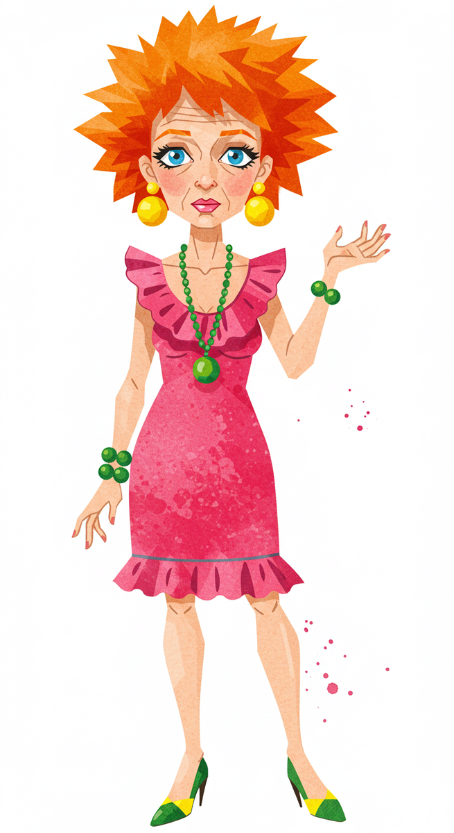 ファッションイラスト的な水彩画のスタイルで、平面的な画像を生成してください.(水彩絵の具の滲みとカスレを表現してください.派手な色彩を強調してください.大胆なフォルムを描写してください.)