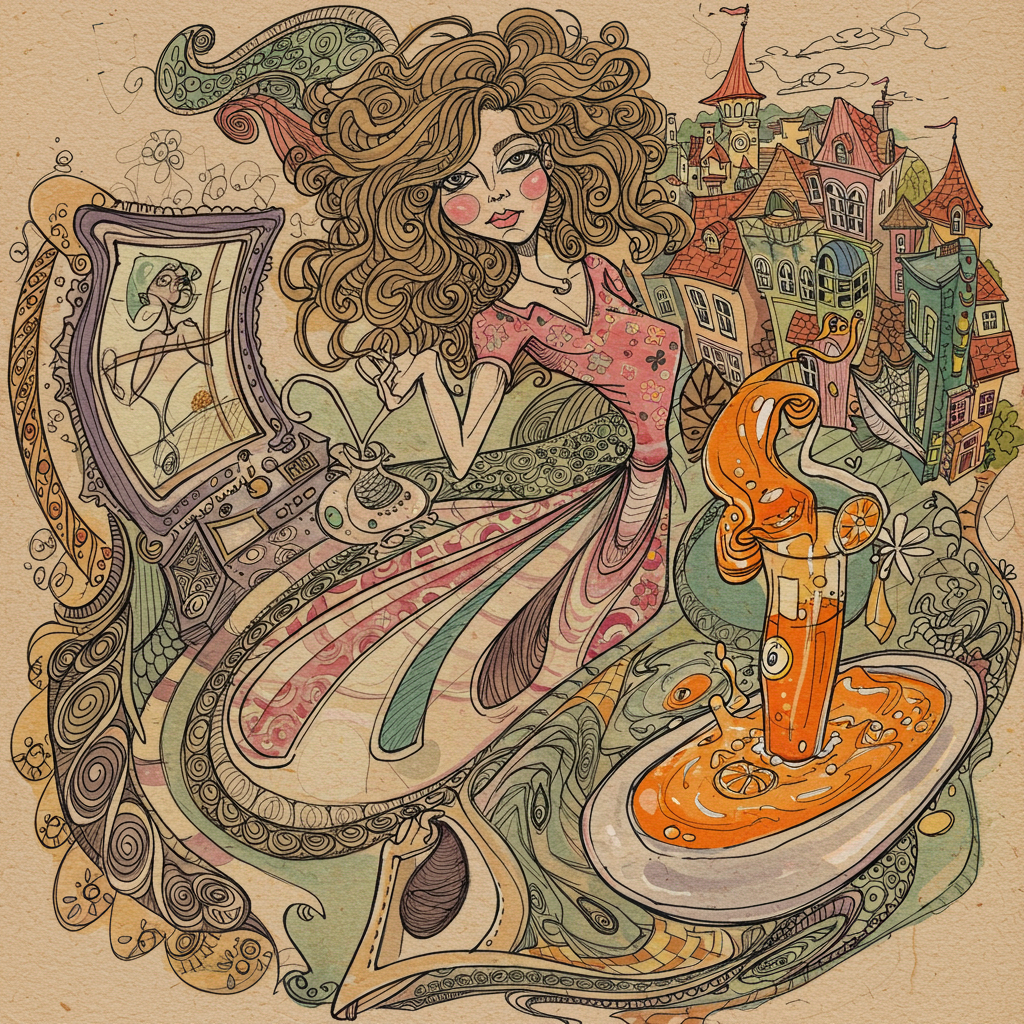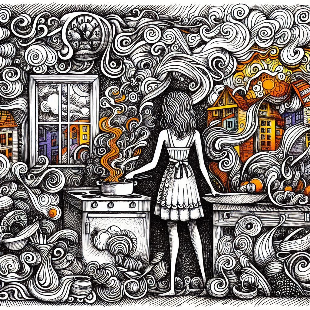 A clumsy ink drawing of "A woman in a sundress, wavy hair. She is cooking in the kitchen with a window in the colorful townscape. Orange juice is boiling in a cook pan. The orange juice is overflowing the chaotic kitchen." The drawing is depicted with winding lines, woolly lines, whirling lines, distorted figures, strange shapes, weird spirals, and whimsical marks on a textured paper. The drawing should be painted in pale and deep watercolors with the bleeding of paints.